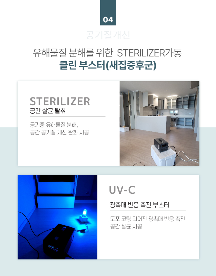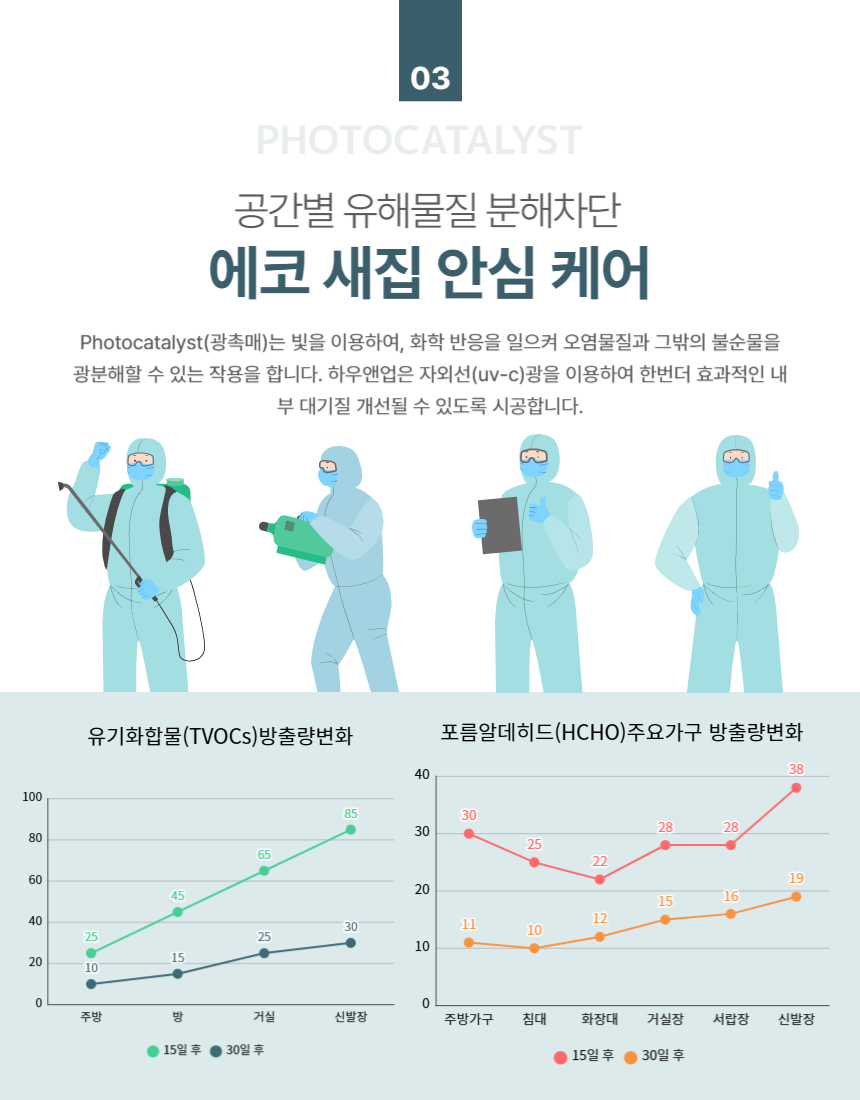 면역력이 약한 영유아, 임산부, 노약자, 반려동물에게 새집 유해 물질은 치명적일 수 있습니다. 새집 안심 케어는 인체 무해한 친환경 공법과 전문 장비를 활용하여 알레르기, 호흡기 질환 등을 유발할 수 있는 요소를 완벽히 제거, 가족 모두가 안심하고 숨 쉴 수 있는 건강한 보금자리를 만들어 드립니다.