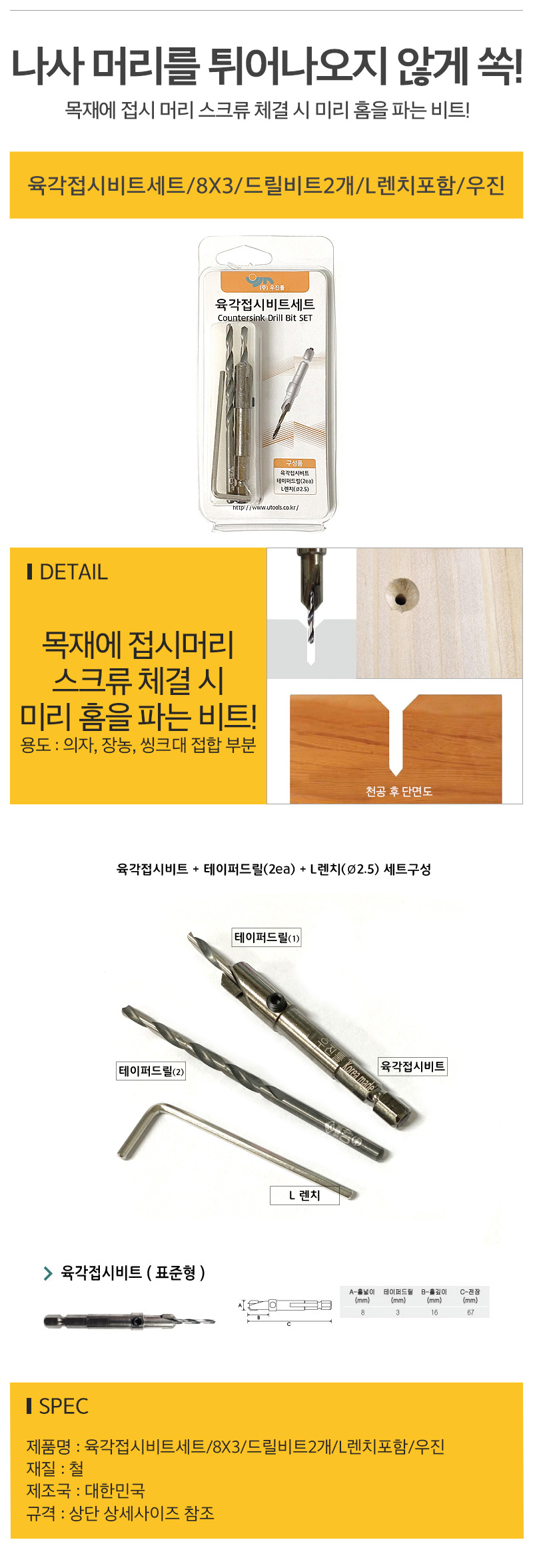 육각접시비트세트/8X3/드릴비트2개/L렌치포함/우진