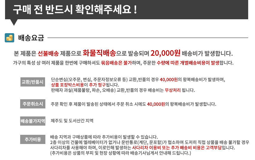 화물을 이용해 배송이 되고 있어 화물 비용 20,000원 ~ 지역별 편차가 발생될 수 있습니다.